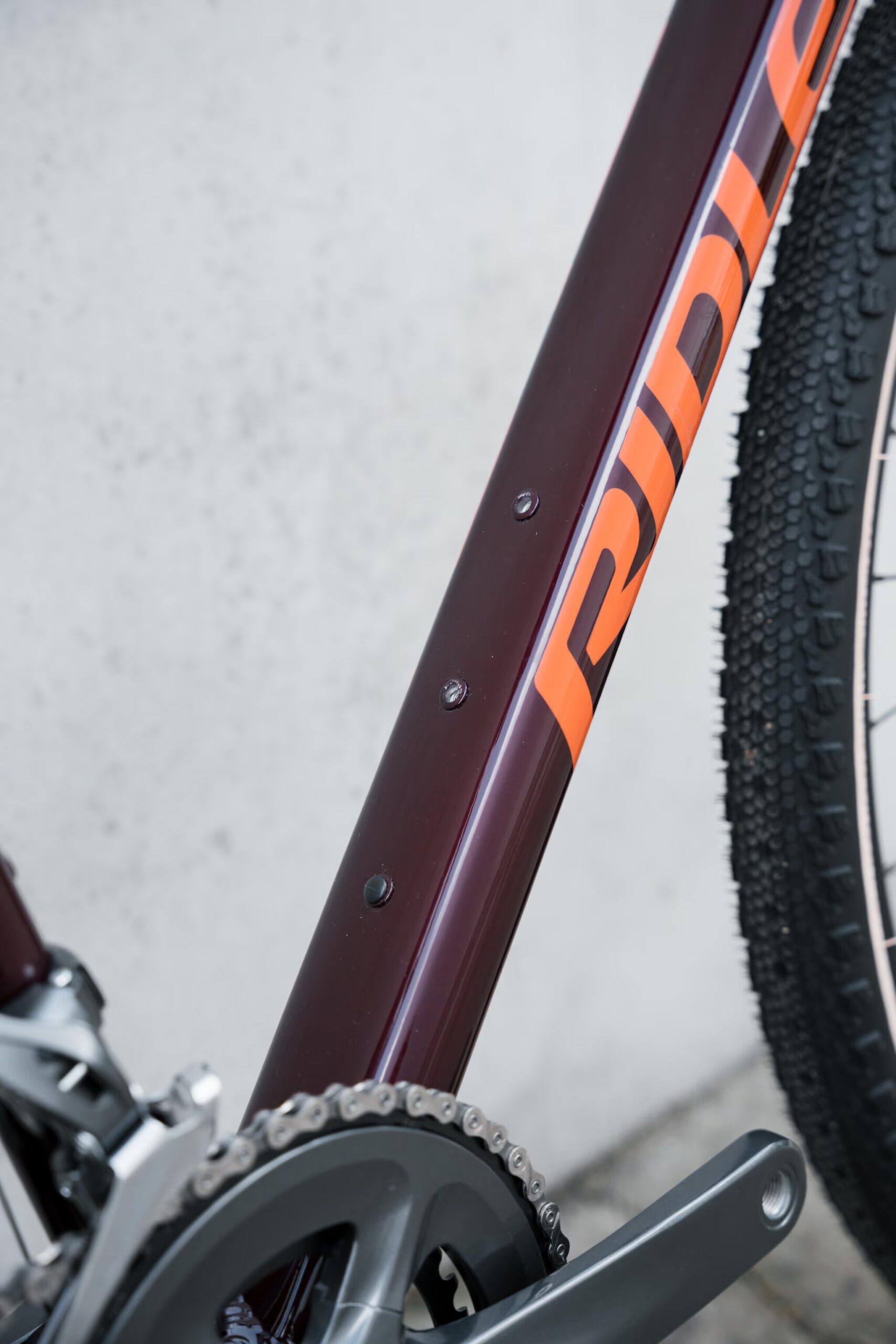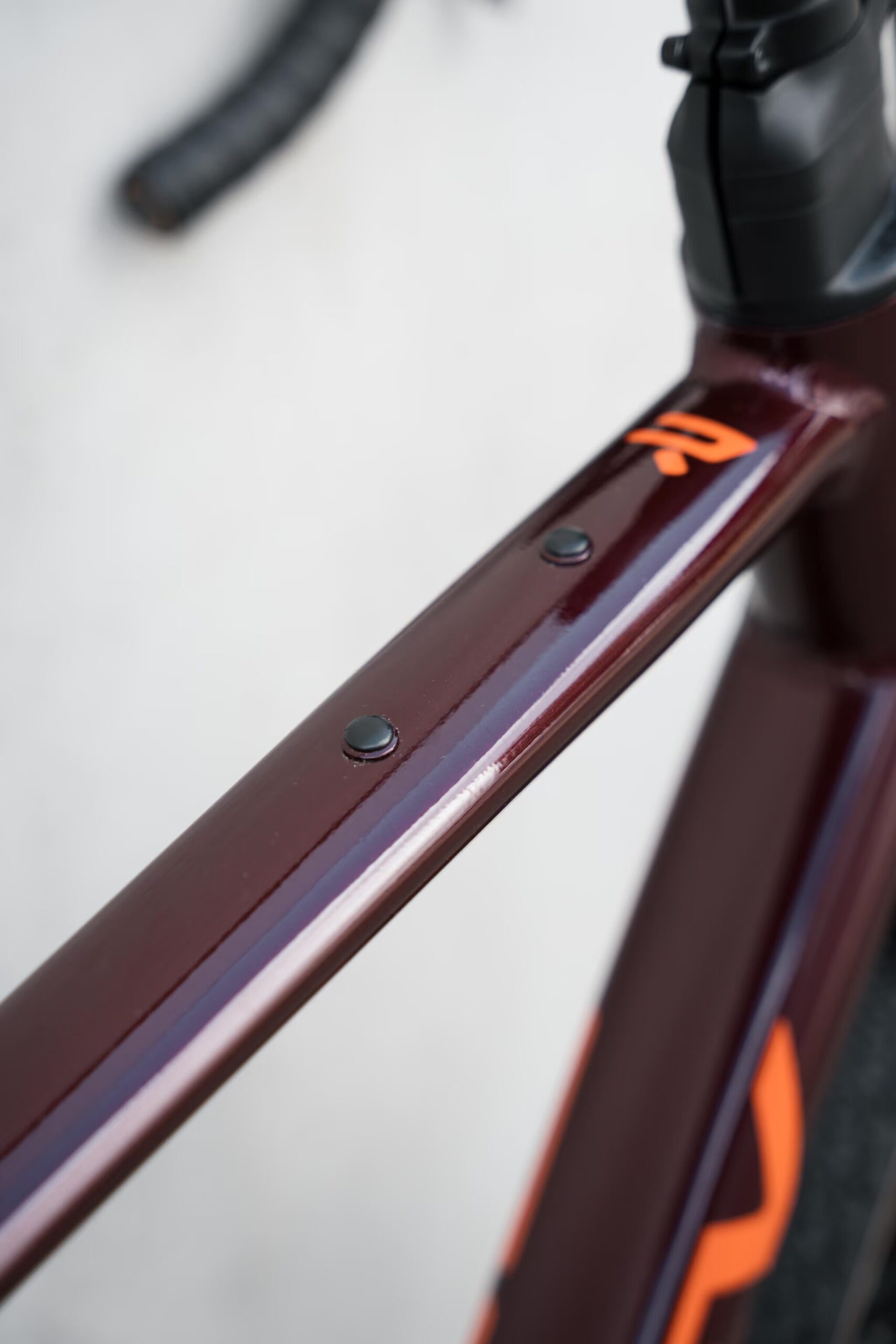 The frame has 2 attachment points on the top tube for a frame bag. Extra handy for carrying some gels, bars or to tuck away your keys! You can also use these attachment points to mount a toolkit.